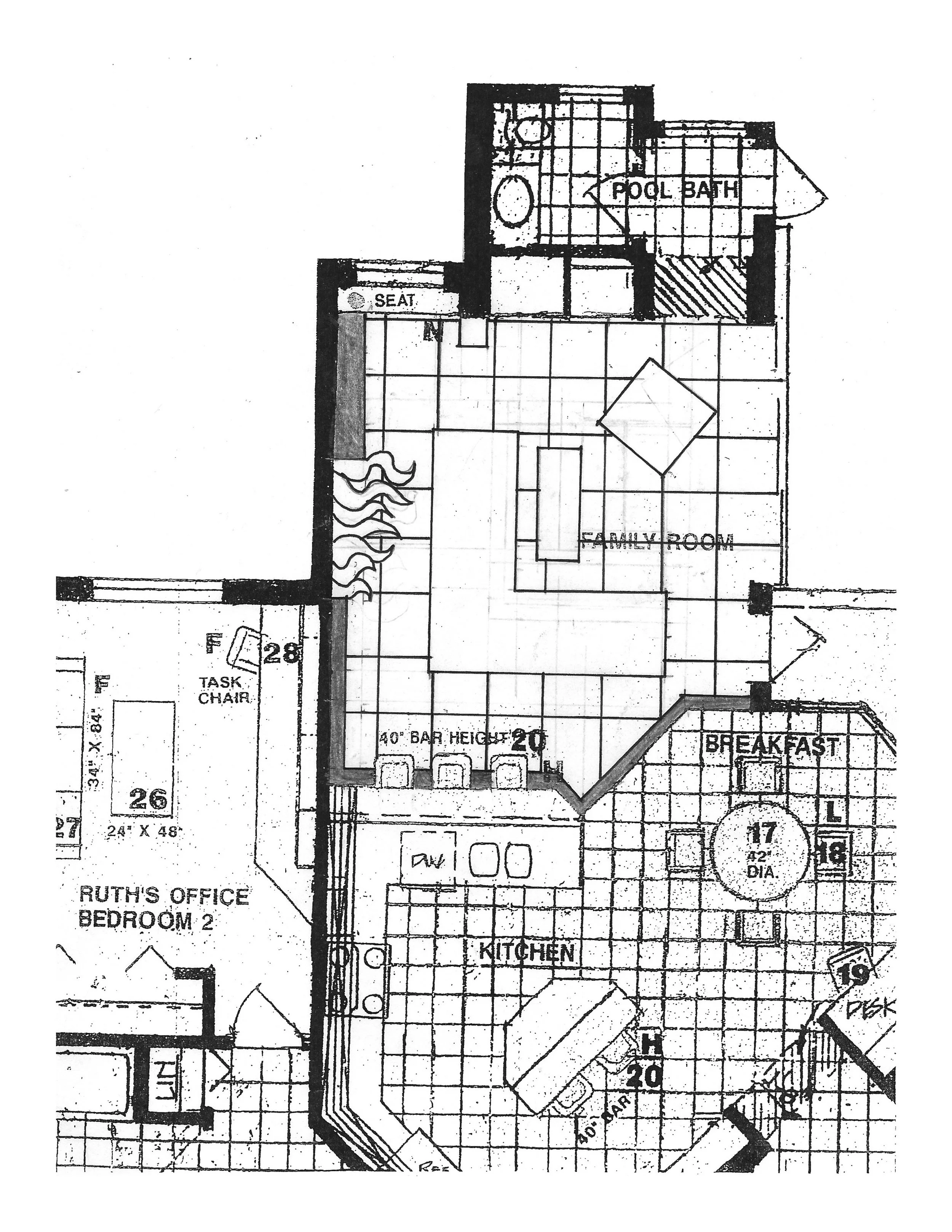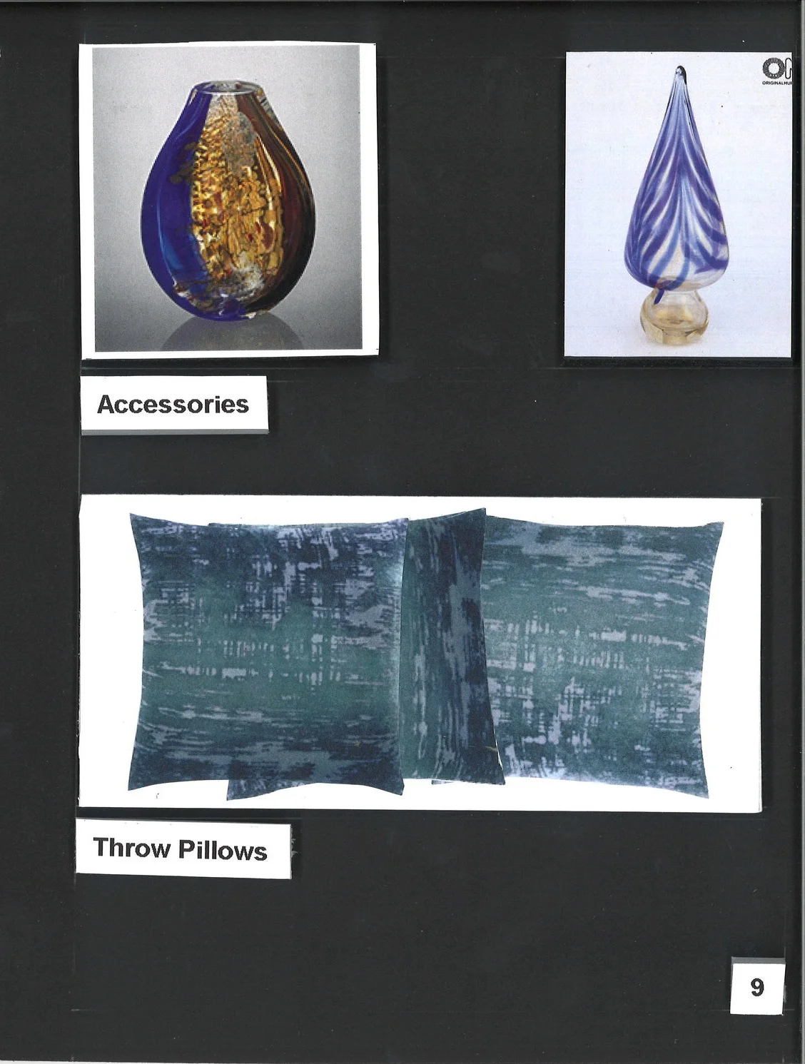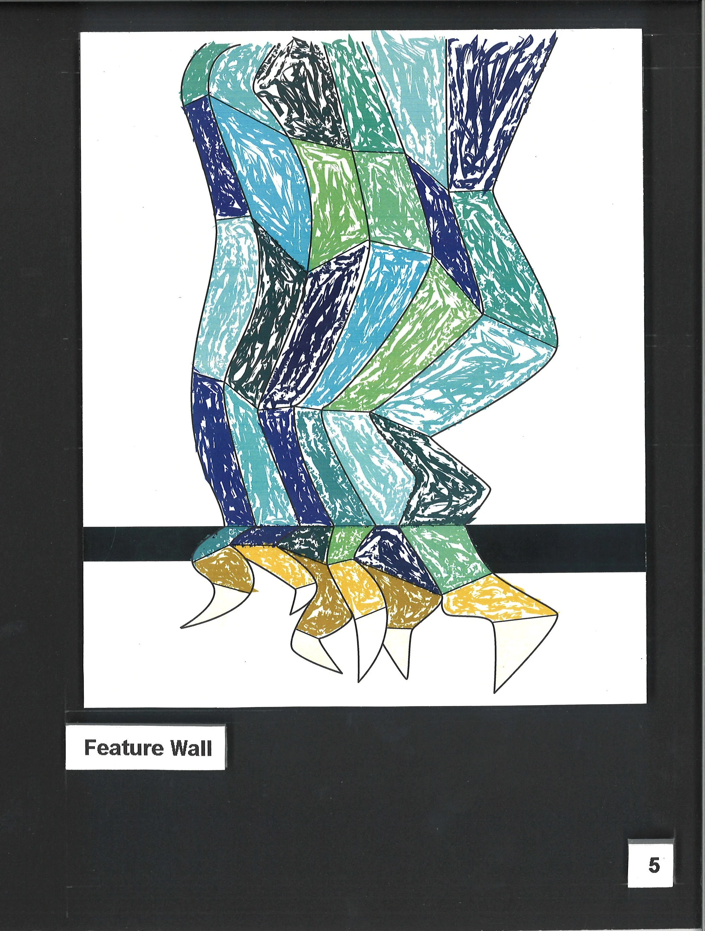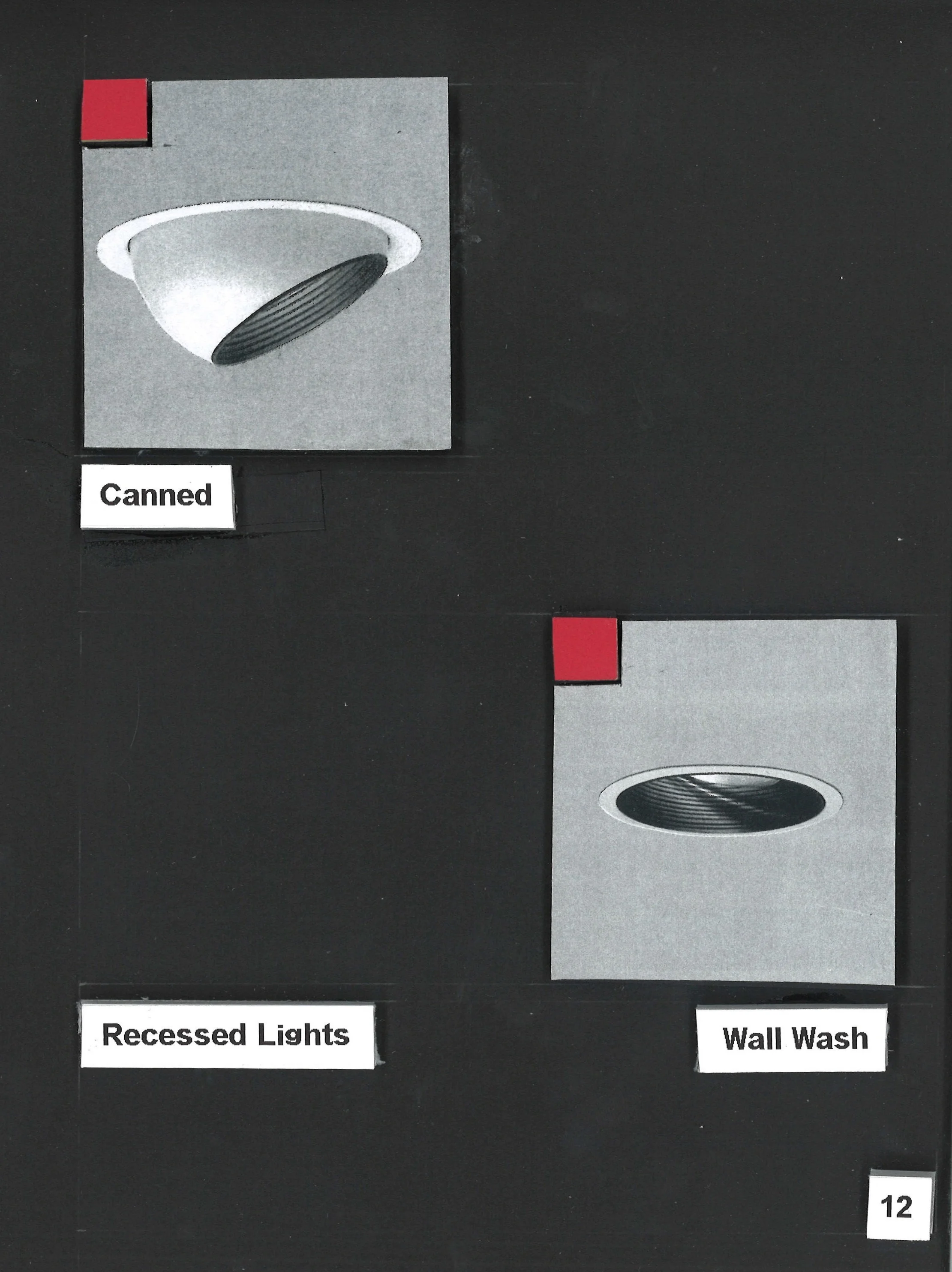 The client requested the inclusion of the song “Ebb Tide”. It uses imagery of waves racing in and planting a kiss on the shore to convey the longing of separated lovers. Inspired by this yearning for contact I wanted to create a piece that would react to touch. The waves flow down the wall and into the floor tile. When walked across and touched by hand it beams and glows. To convey the lighting effect I created a mockup utilizing the different opacities of paper and transparency film.