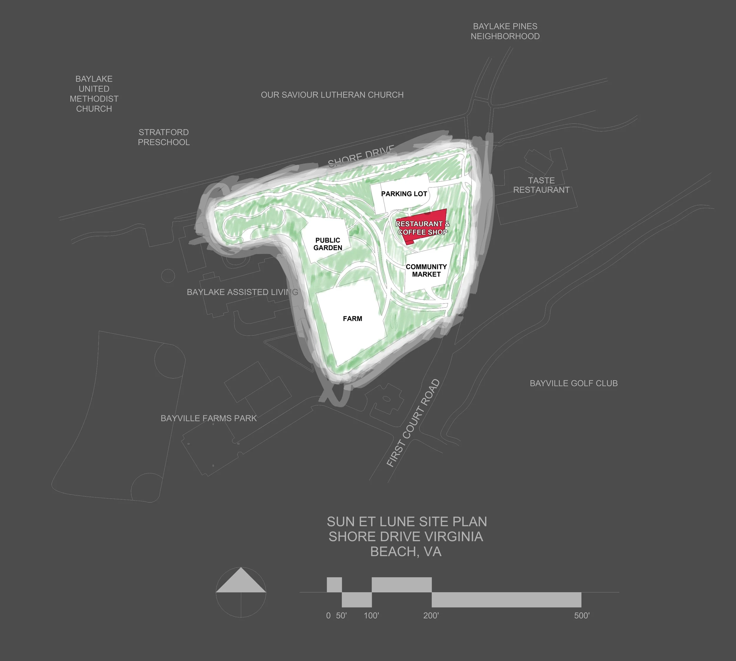 Made in collaboration with Ethan Simmerson. In this LEED BD + C Certified project we wanted a communal space the integrates the cycles of man and nature. We took an empty playing field of the Bayville Farms Park in the Bayside neighborhood of Virginia Beach, VA and designed public areas for studying, mingling, snacking, and meditating. To create intimacy in such a large lot we create programmed different area to create little pockets. Meandering paths connect a public garden, coffee shop, restaurant, farm, labyrinth, and shifting community market. Too dreamy and earthy selections create a comforting yet imaginative atmosphere.